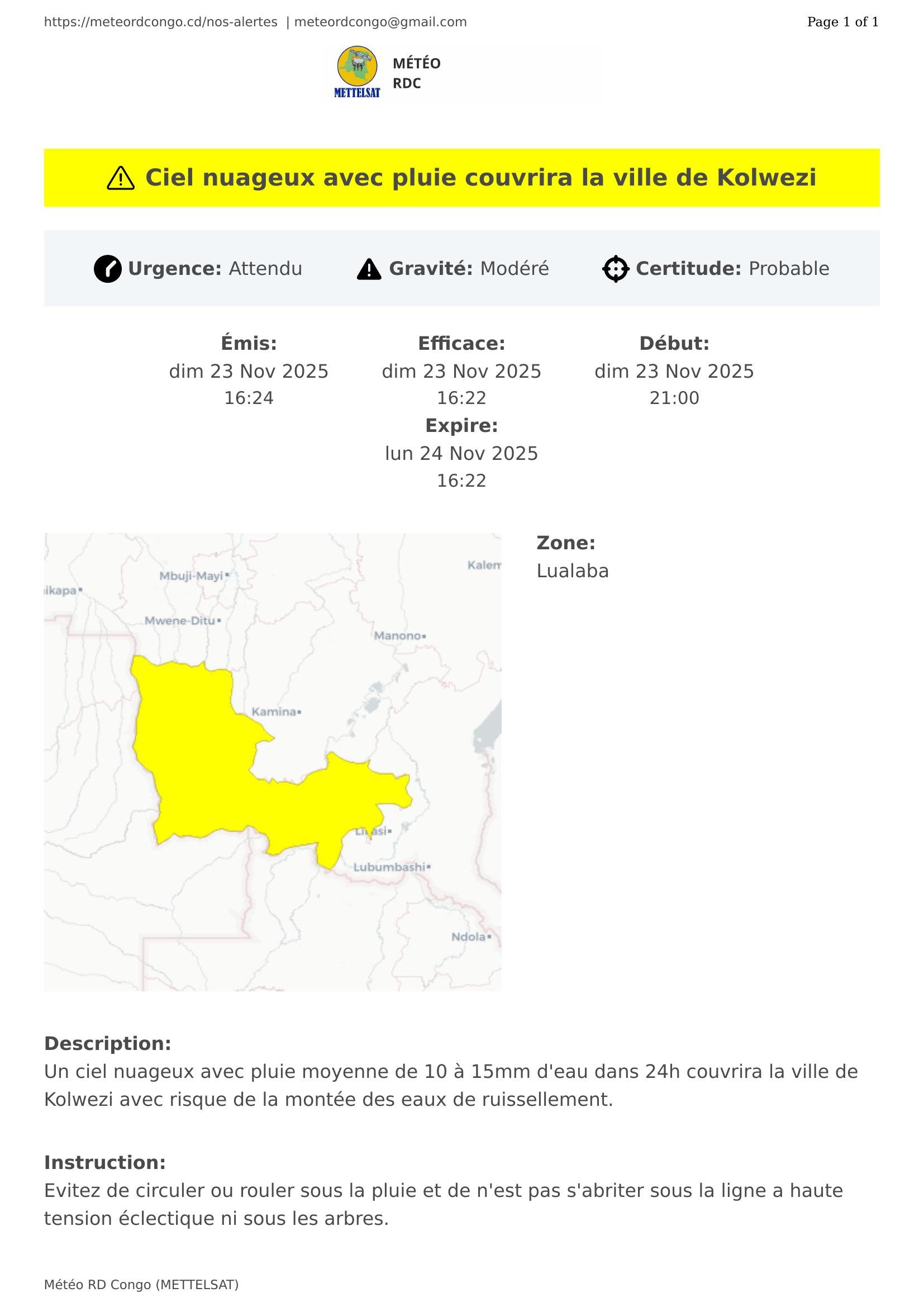 Un ciel nuageux avec pluie moyenne de 10 à 15mm d'eau dans 24h couvrira la ville de Kolwezi avec risque de la montée des eaux de ruissellement.