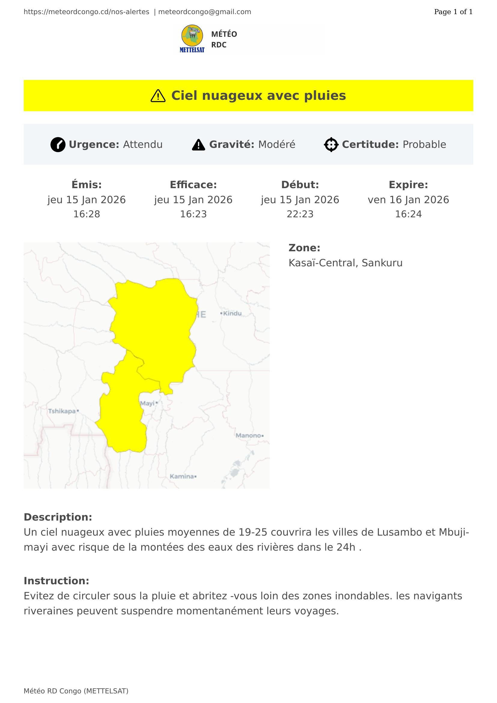 Un ciel nuageux avec pluies moyennes de 19-25 couvrira les villes de Lusambo et Mbuji-mayi avec risque de la montées des eaux des rivières dans le 24h .
