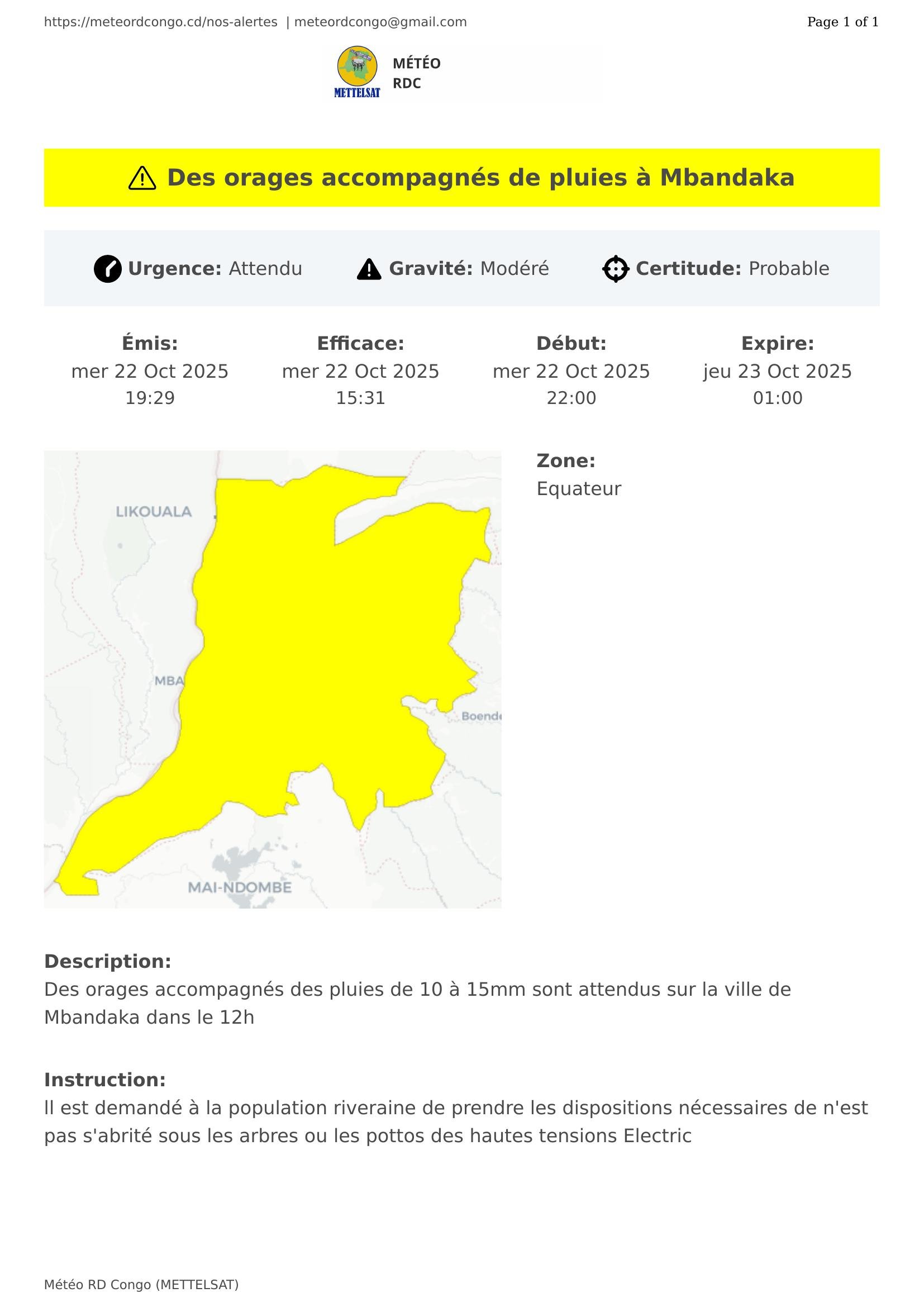 Des orages accompagnés des pluies de 10 à 15mm sont attendus sur la ville de Mbandaka dans le 12h