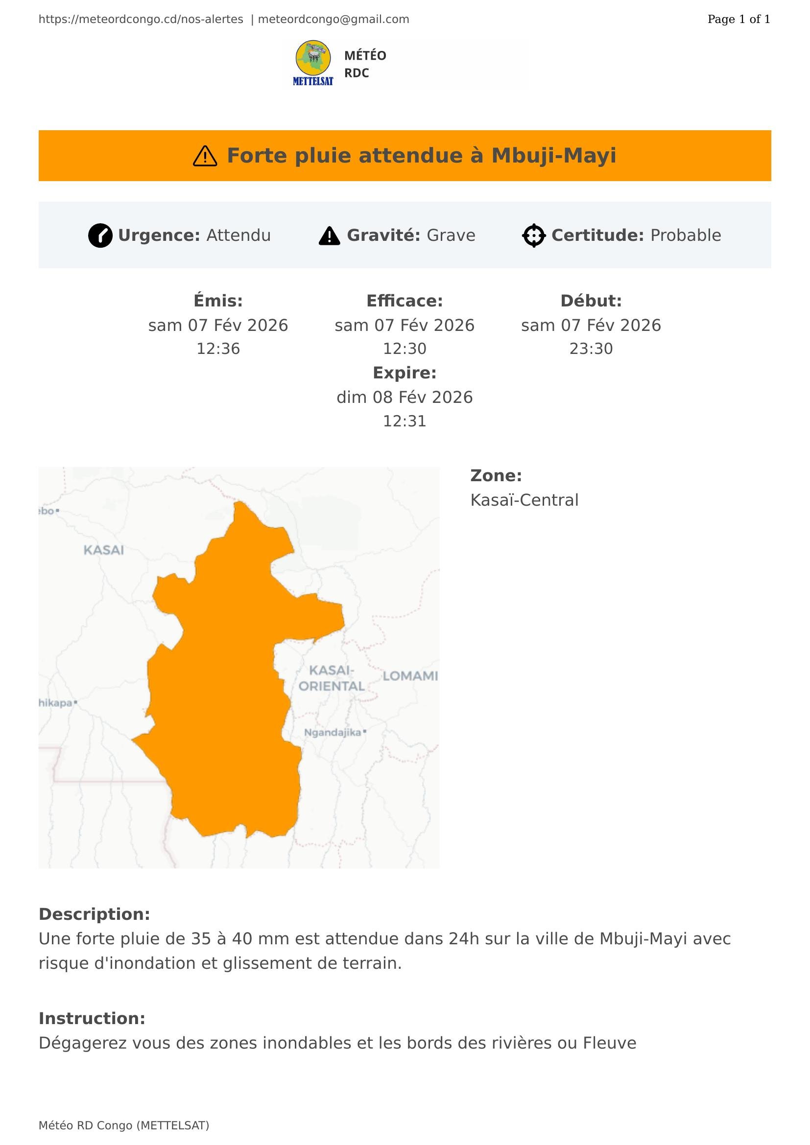 Une forte pluie de 35 à 40 mm est attendue dans 24h sur la ville de Mbuji-Mayi avec risque d'inondation et glissement de terrain.