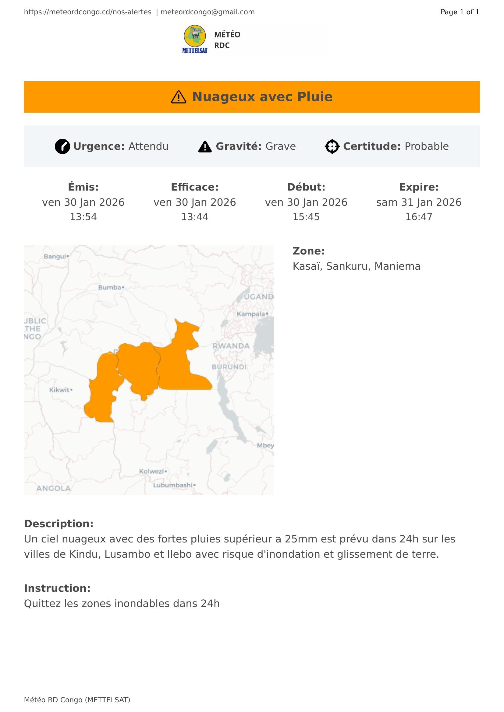 Un ciel nuageux avec des fortes pluies supérieur a 25mm est prévu dans 24h sur les villes de Kindu, Lusambo et Ilebo avec risque d'inondation et glissement de terre.