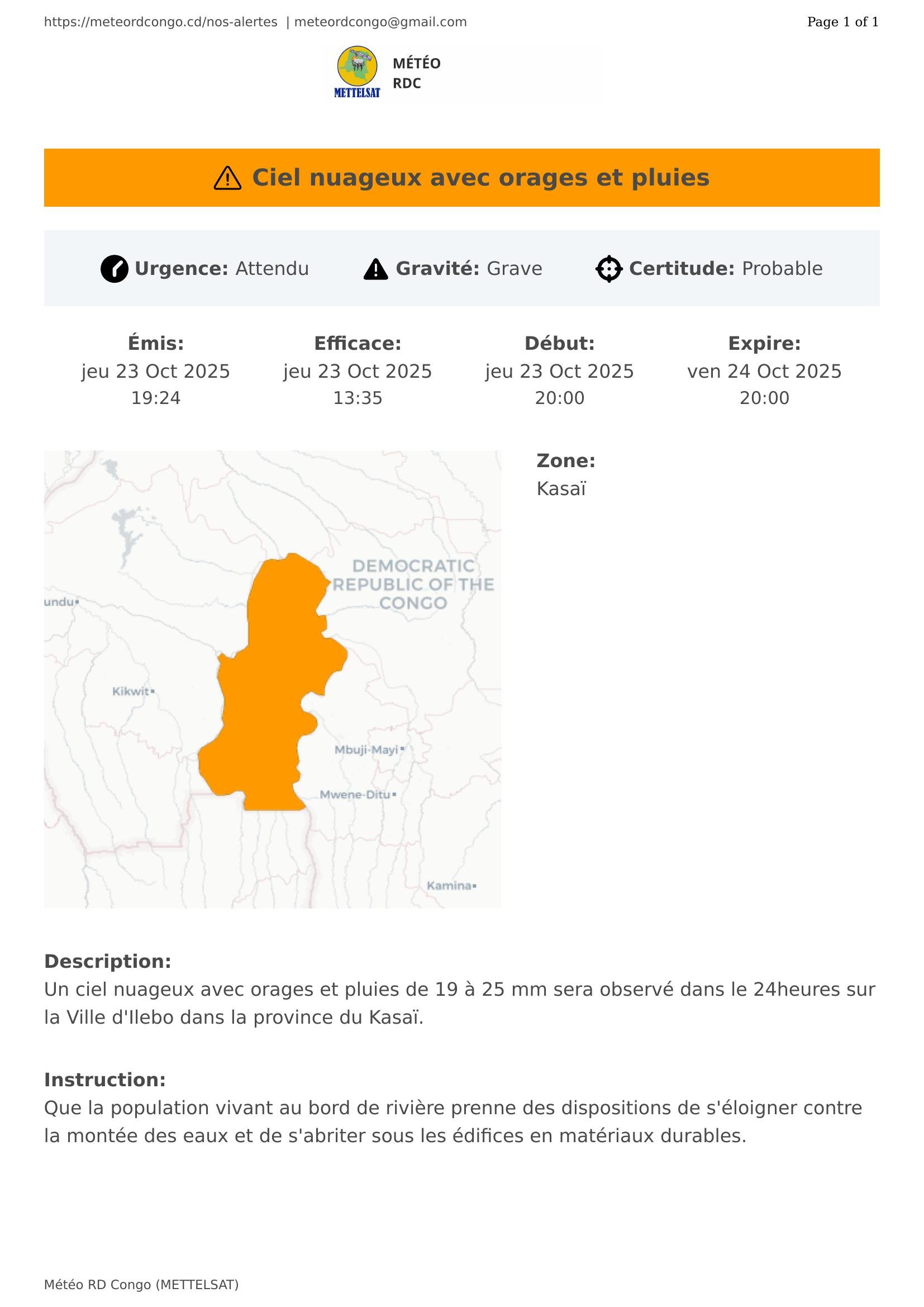 Un ciel nuageux avec orages et pluies de 19 à 25 mm sera observé dans le 24heures sur la Ville d'Ilebo dans la province du Kasaï.
