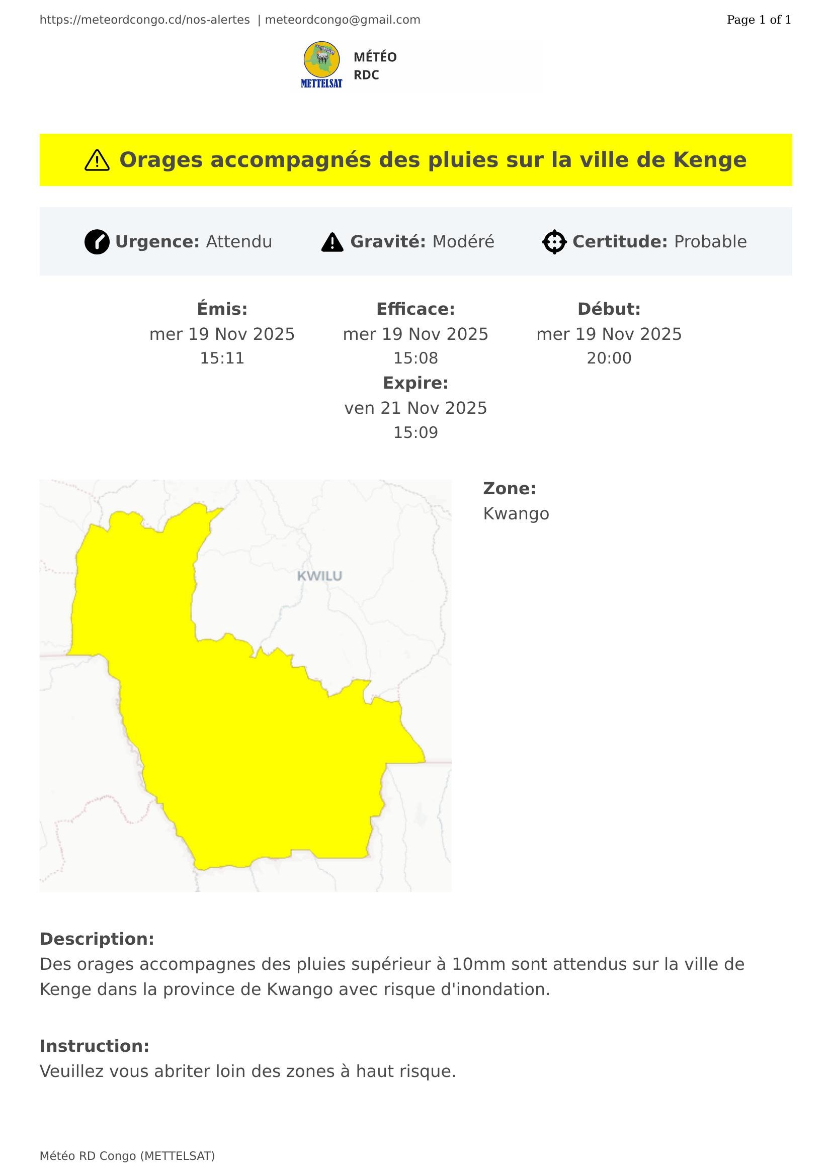 Des orages accompagnes des pluies supérieur à 10mm sont attendus sur la ville de Kenge dans la province de Kwango avec risque d'inondation.