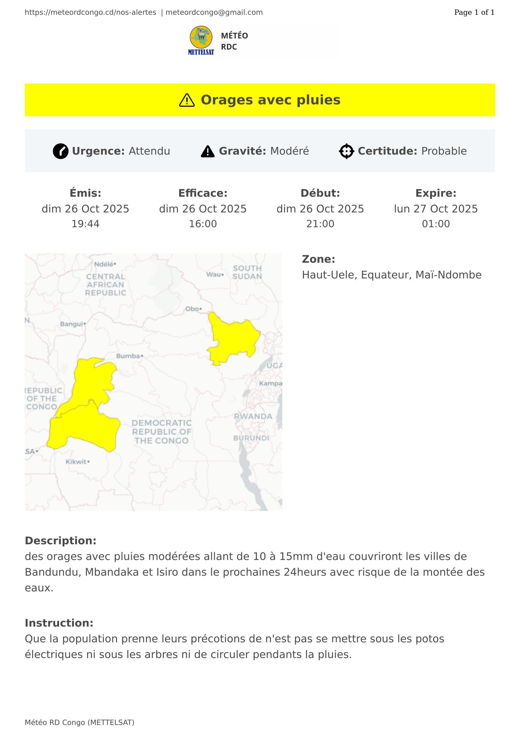 des orages avec pluies modérées allant de 10 à 15mm d'eau couvriront les villes de Bandundu, Mbandaka et Isiro dans le prochaines 24heurs avec risque de la montée des eaux.