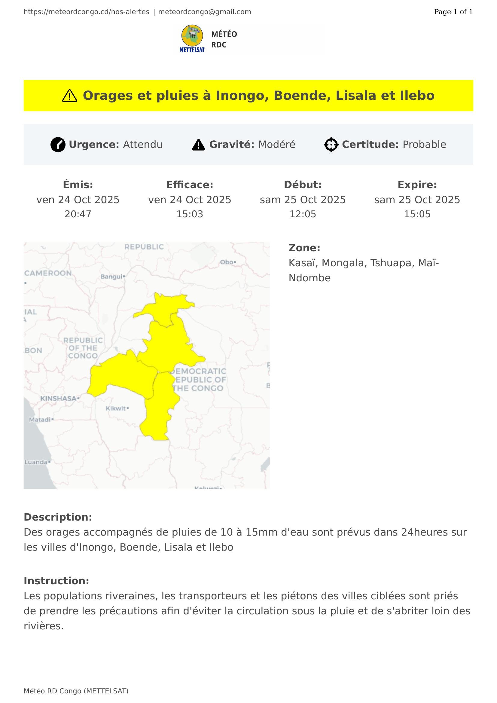 Des orages accompagnés de pluies de 10 à 15mm d'eau sont prévus dans 24heures sur les villes d'Inongo, Boende, Lisala et Ilebo
