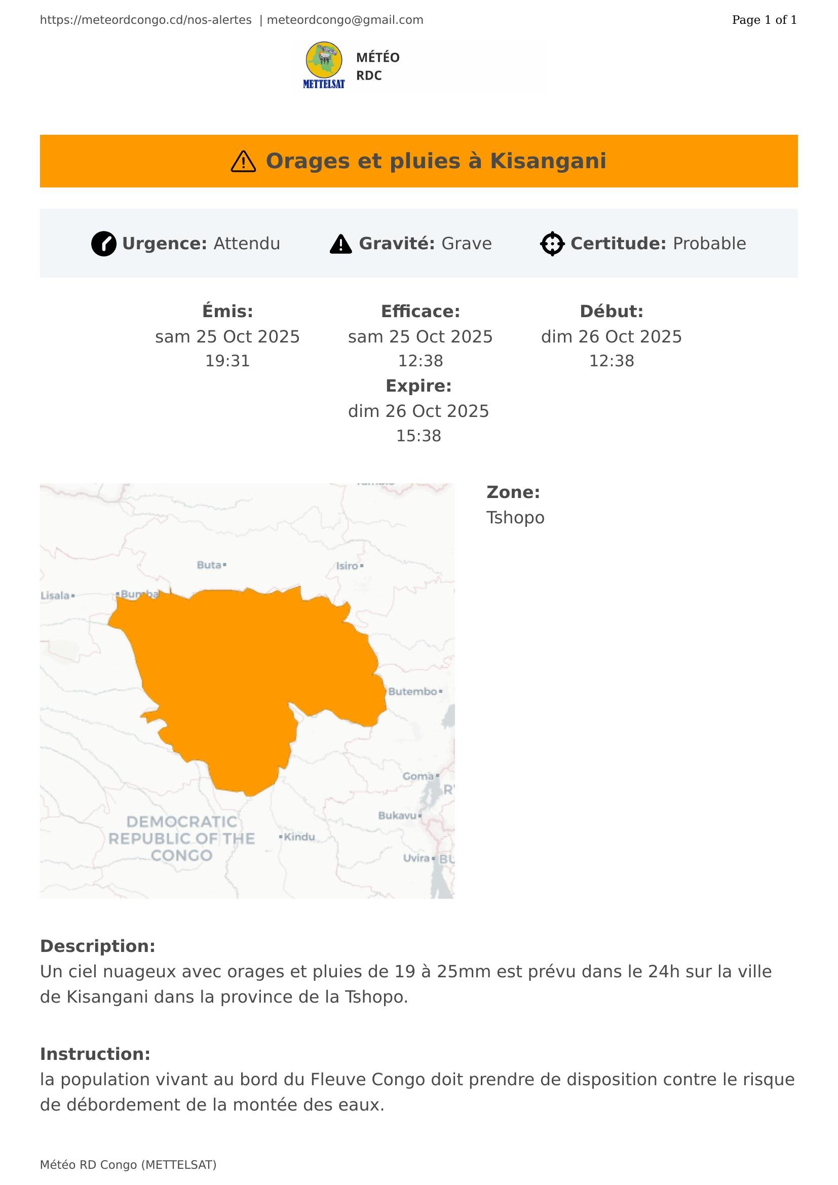 Un ciel nuageux avec orages et pluies de 19 à 25mm est prévu dans le 24h sur la ville de Kisangani dans la province de la Tshopo.