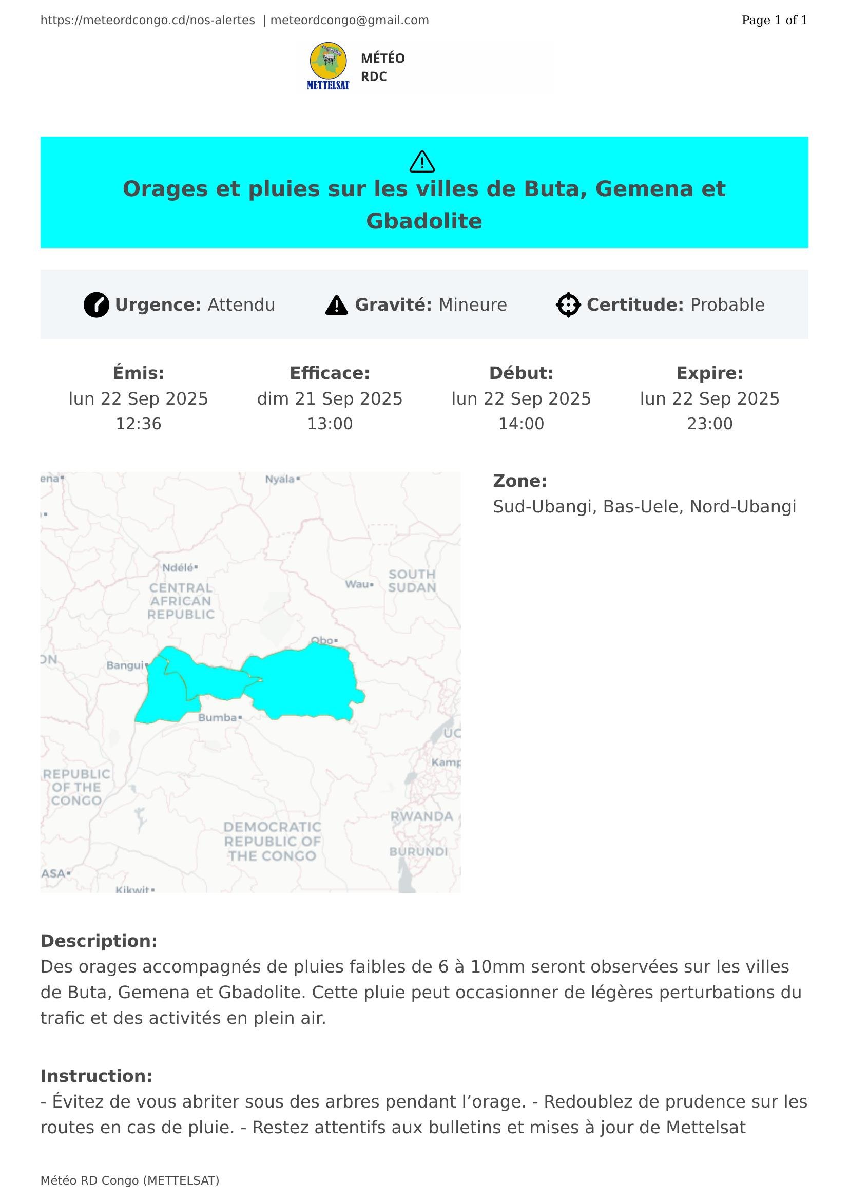 Des orages accompagnés de pluies faibles de 6 à 10mm seront observées sur les villes de Buta, Gemena et Gbadolite. Cette pluie peut occasionner de légères perturbations du trafic et des activités en plein air.