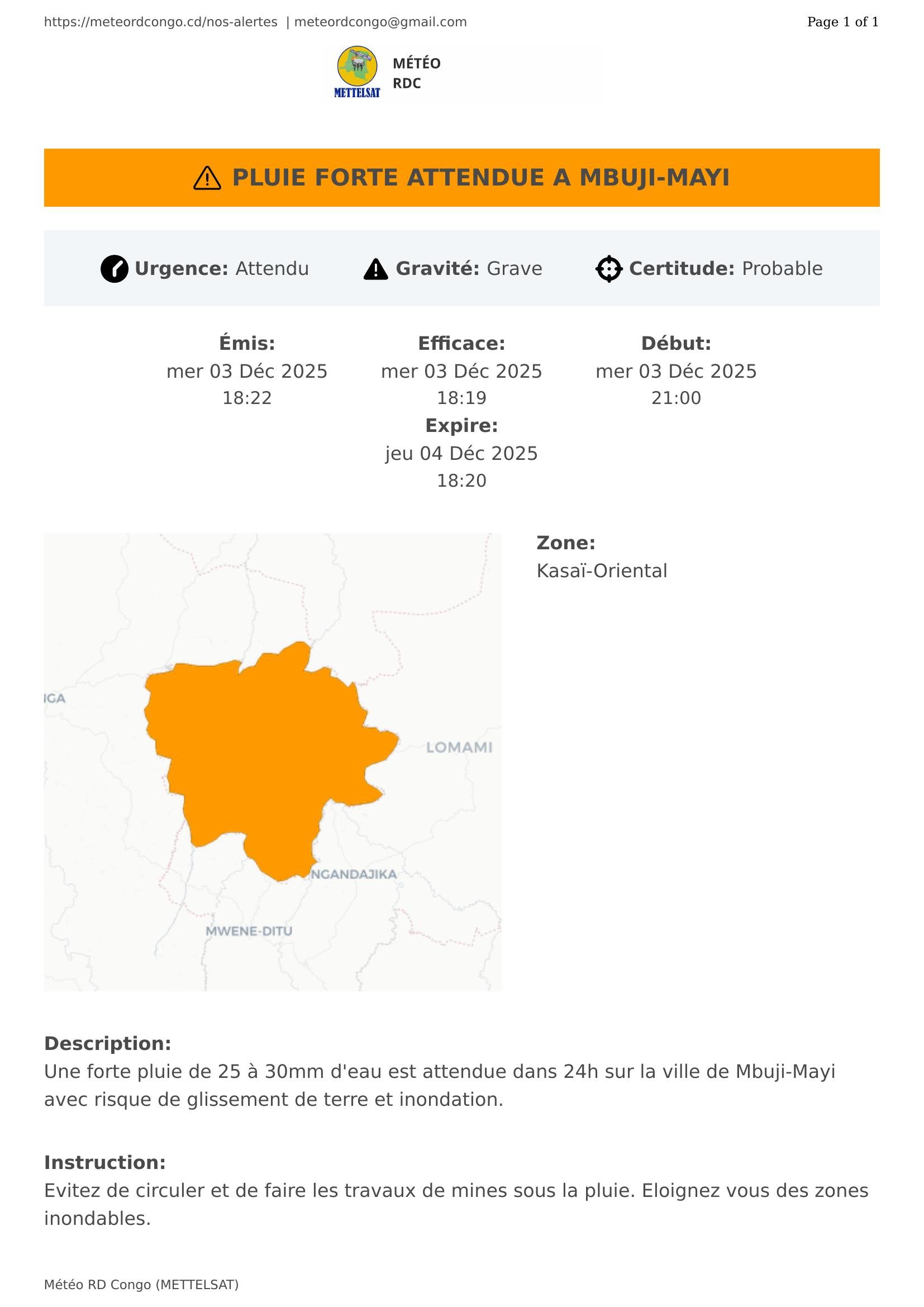 Une forte pluie de 25 à 30mm d'eau est attendue dans 24h sur la ville de Mbuji-Mayi avec risque de glissement de terre et inondation.