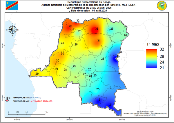 Carte thermique du 04 au 05 avril 2026 pour la République Démocratique du Congo. Elle illustre la répartition des températures maximales à travers le pays.